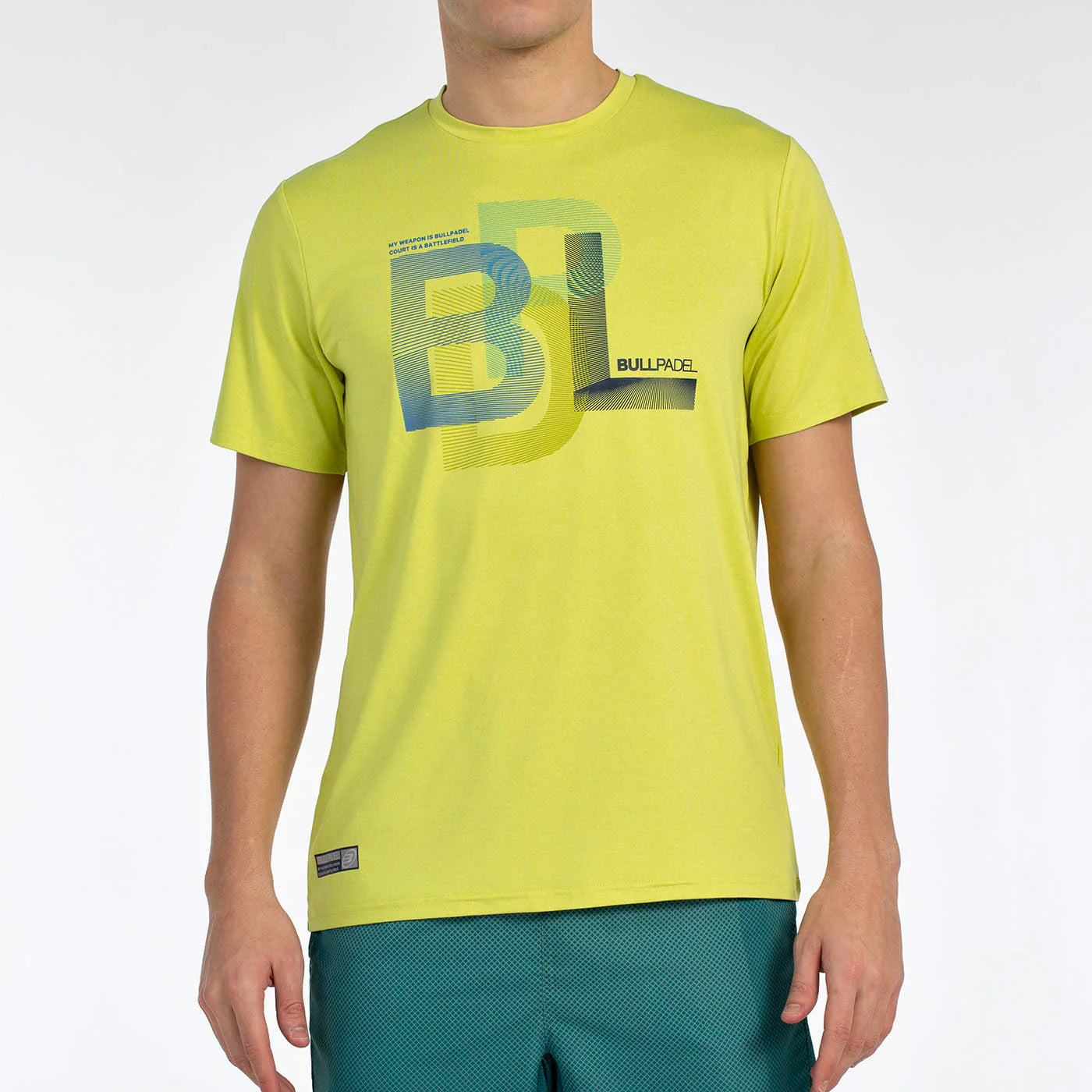 Camiseta de single jersey de poliéster elástico con aspecto vigoré, cuello a la caja y estampación en el pecho.